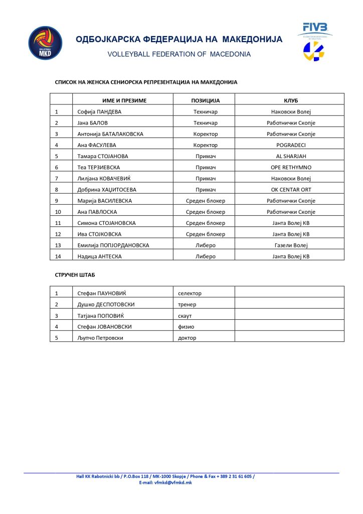 Селекторот на женската сениорска репрезентација Стефан Пауновиќ се одлучи со кои 14 репрезентативки ќе настапи на првиот натпревар против Луксембург, кој Македонија го игра утревечер, 20 часот, во салата „Парк“ во Струмица на отворањето на првиот турнир од ЦЕВ Европската Сребрена лига 2025.